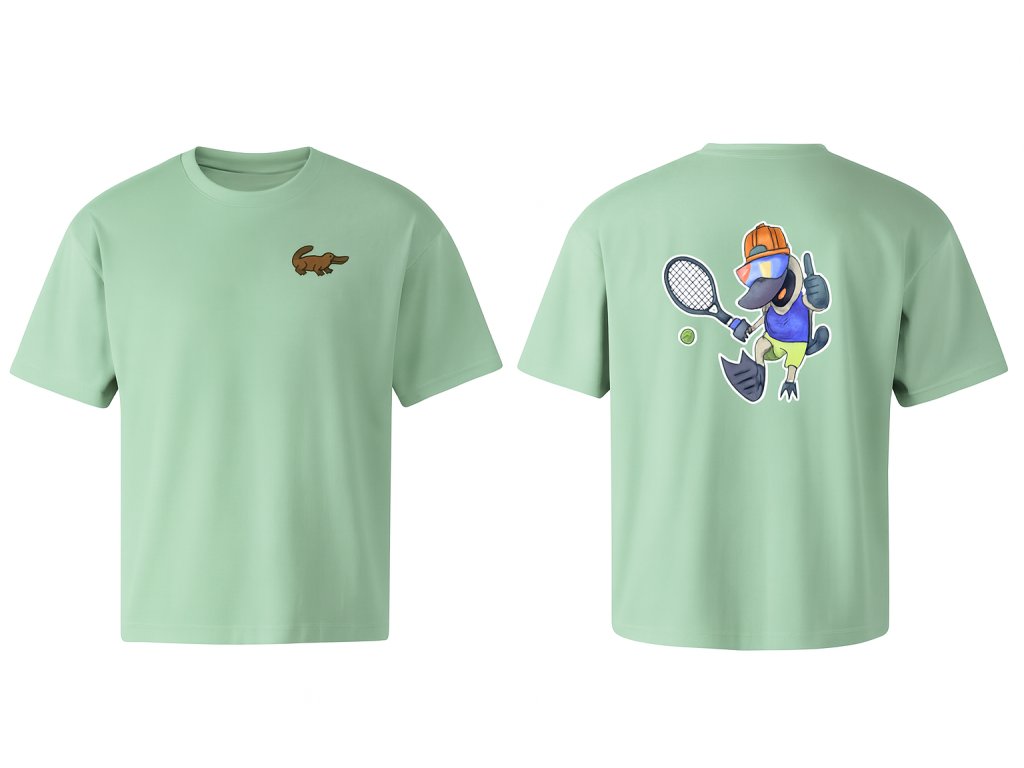 Tohle oversized tričko je součástí oficiálního merchu Ravelin Tennis Club a vzniklo ve spolupráci s umělcem Pauserem, který navrhl osobitou grafiku našeho klubového maskota — ptakopyska Perry.